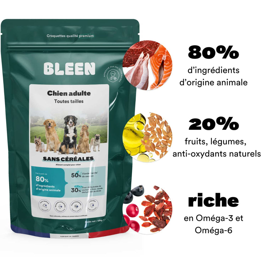 Si vous choisissez les croquettes Bleen, vous n'aurez pas besoin de prendre en plus des compléments alimentaires. Pourquoi ? Nos recettes ont été élaborées pour être parfaitement équilibrées et apporter les nutriments essentiels à la bonne santé de nos chiens.